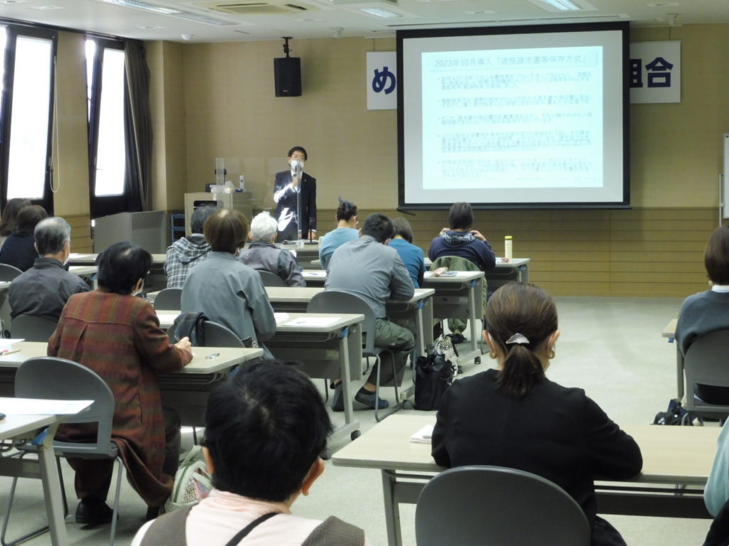11月20日(土)、全建総連より西税金対策部長を講師に迎えインボイス制度の講習会を開催し、制度に関心のある多くの方にご参加いただきました。