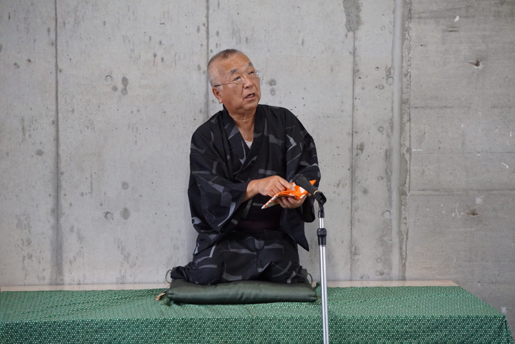 高座名を「あばらや匠」と称し、大須演芸場で披露するほどの実力の持ち主の藪本さんは、灰色の美しい着物をまとい舞台に上がりました。軽快なリズムで私たちを話の中に引き込んでいきました。演目を2つ披露し、1つは「粗忽長屋」。18番は、また次回、呼んでもらうために残しておき、2つ目は2番目に得意な「親の顔」。30分ほど続いた最後の落ちが話されると、会場内は一斉に大笑いと拍手が鳴りやまないほどの盛況ぶりでした。