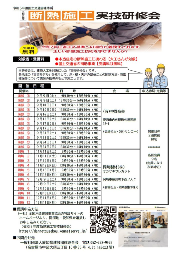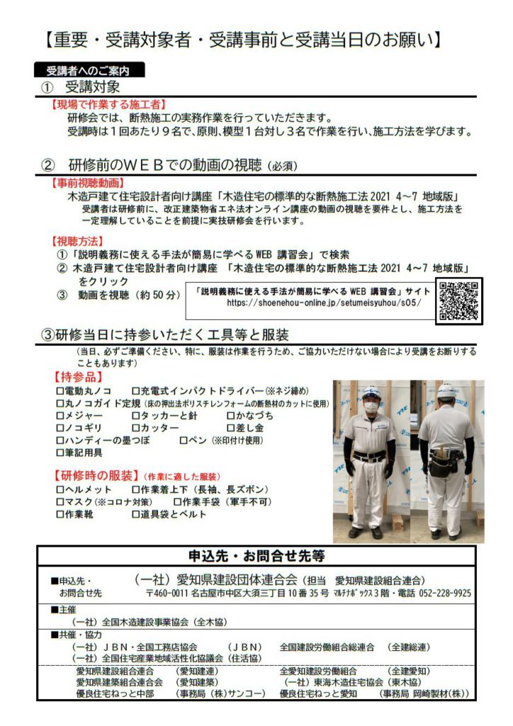 「断熱施工実技研修会」開催 講習会&試験日程技術を高める 2023年6月28日更新 受講者募集中!(受講料無料) 受講申込方法は・・・https://dannetsusekou.kennetserve.jp/