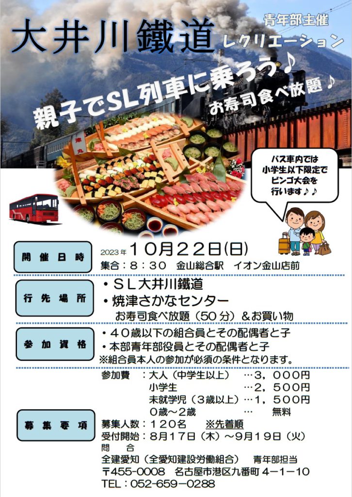 今回は、静岡県大井川鐵道「SL乗車」と焼津さかなセンターにて「お寿司食べ放題」に行きます。大井川沿いののどかな風景の中を走るSL列車の醍醐味をぜひ味わってみてください。