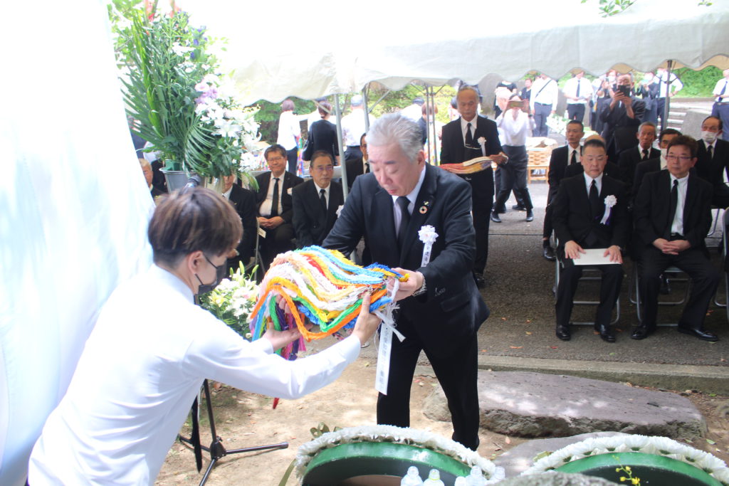 8月8日(火)、全建総連と建設長崎は長崎市原爆公園内「建設労働者職人原爆殉難者慰霊不戦平和の塔」前にて開催された慰霊祭に列席しました。