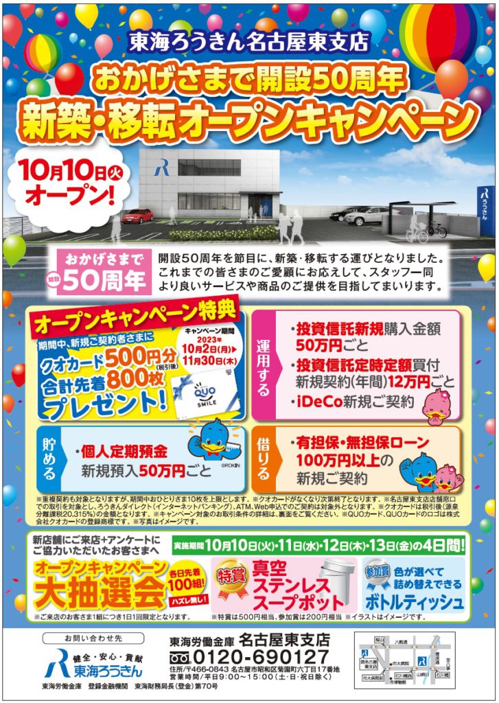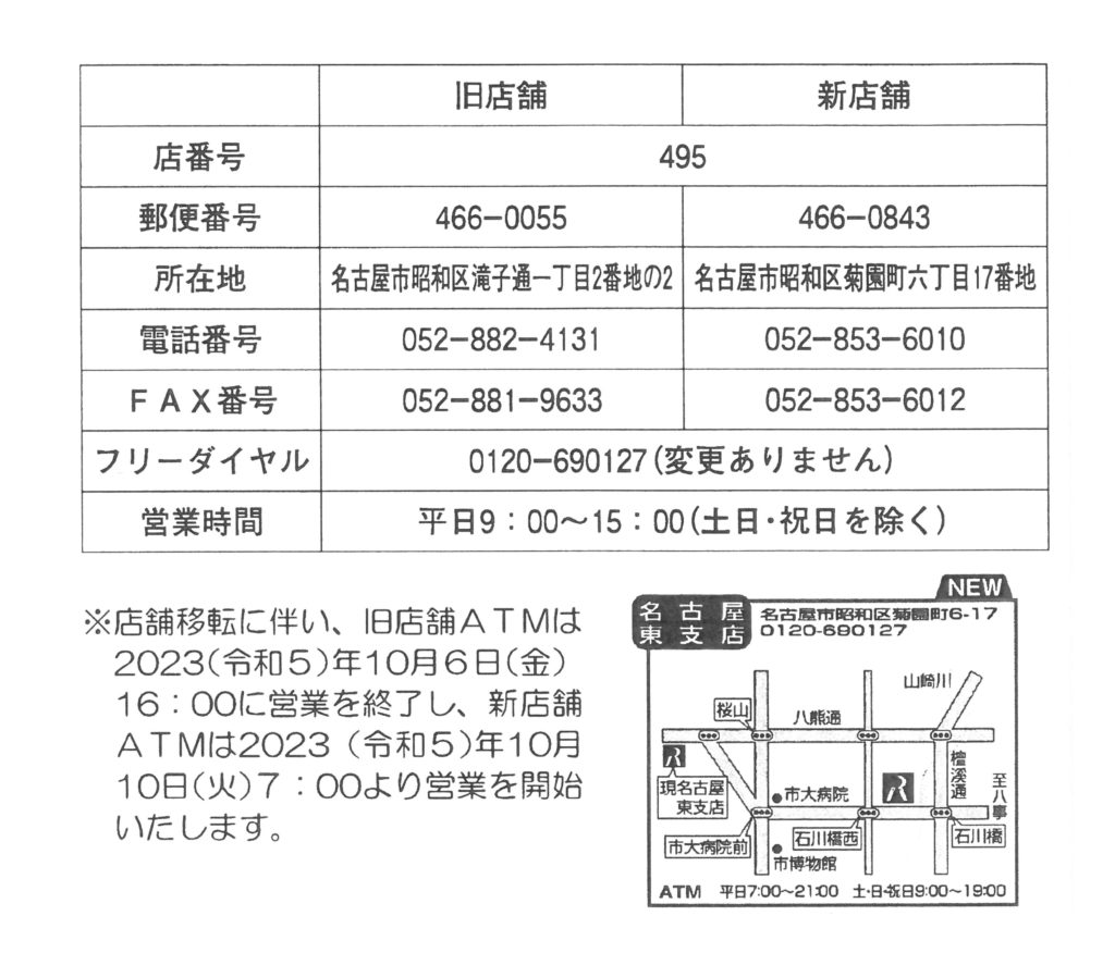 東海労働金庫「名古屋東支店」は、2023(令和5)年10月6日(金)をもち現住所での営業を終了し、2023(令和5)年10月10日(火)より新店舗へ移転いたします。
