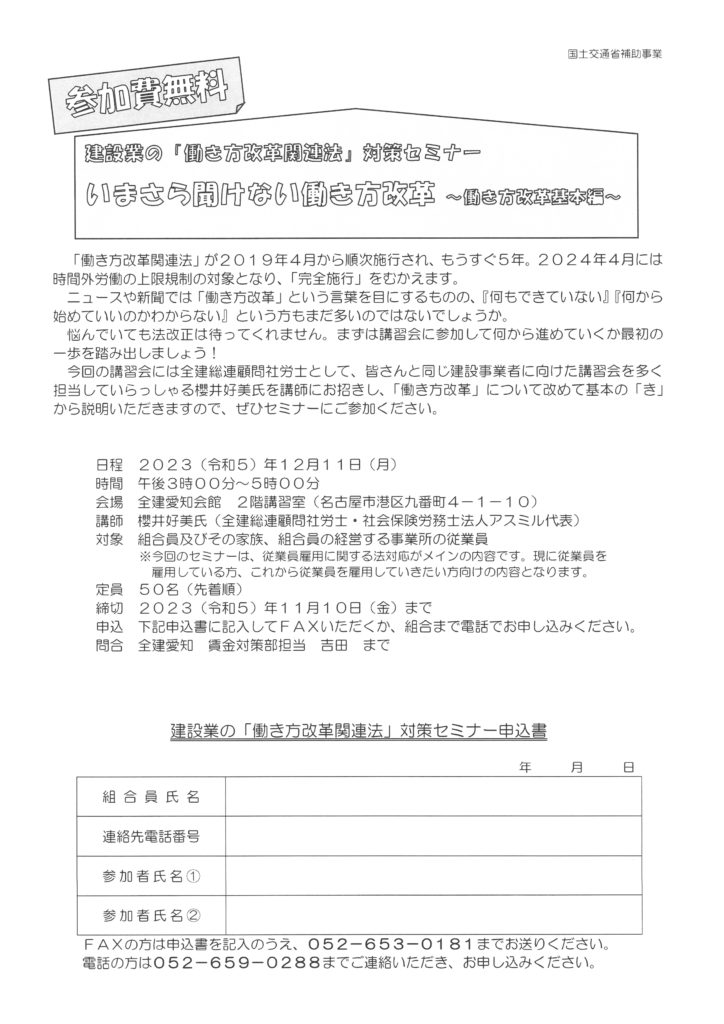 建設業の「働き方改革関連法対策セミナー」開催 安定した賃金 2023年11月1日更新 いまさら聞けない働き方改革<働き方改革基本編> 下記の通り、「いまさら聞けない働き方改革セミナー」を開催します。是非この機会にご参加ください。(参加費無料です)