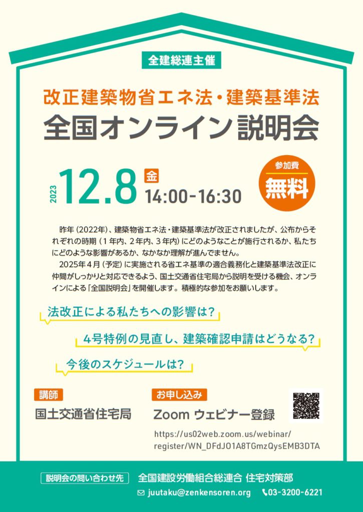 2025年4月(予定)に実施される省エネ基準の適合義務化と建築基準法改正に仲間がしっかりと対応できるよう、国土交通省住宅局から説明を受ける機会、オンラインによる「全国説明会」を開催します。ぜひ、ご受講いただきますようよろしくお願いいたします。