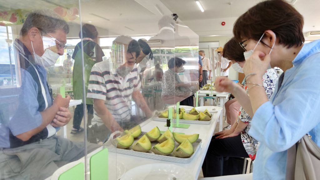 メロン狩りの後は、メロンの食べ放題の会場へ移動。食べたメロンは甘く瑞々しく、乾いた喉と胃袋を潤してくれました。「普段以上に食べてしまった」と、みなさん満足の笑顔でした。