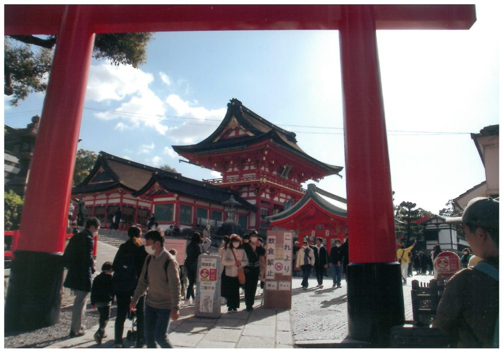 最初に千本鳥居で有名な伏見稲荷大社に着きました。御朱印を頂ける所で並んでいた、竹上くるみさん(8歳)にお話を聞きました。「こちらでは御朱印を押すのではなく、あらかじめ印刷したものを自分で貼るようにくださる」と、笑顔で答えてくれました。