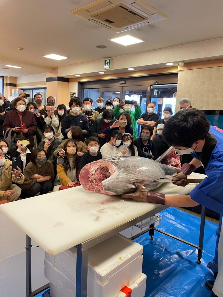 長崎産の重さ54㎏のマグロの登場です。各テーブルを回り始めると写真を撮る人、覗き込み大きさに驚く人がいました。ひと通り回ると解体専用のまな板に、あまりの大きさにマグロと一緒に写真を撮っている子供さんもみえました。解体専用の包丁で頭から色々な部位に切り分けていく姿に釘付けになってしまいました。さばきたてのマグロは新鮮で、とっても美味しかったです。