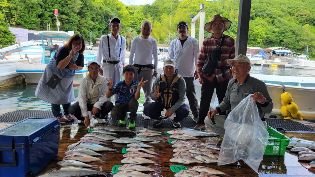 真鯛の活性が上がったのか、ぽつぽつと釣れ出し、あちらこちらで竿を曲げています。鯛が逢いに来てくれました。2回目の放流後、青物も釣れたのですが、痛恨のバラシが目立ち、大会終了です。