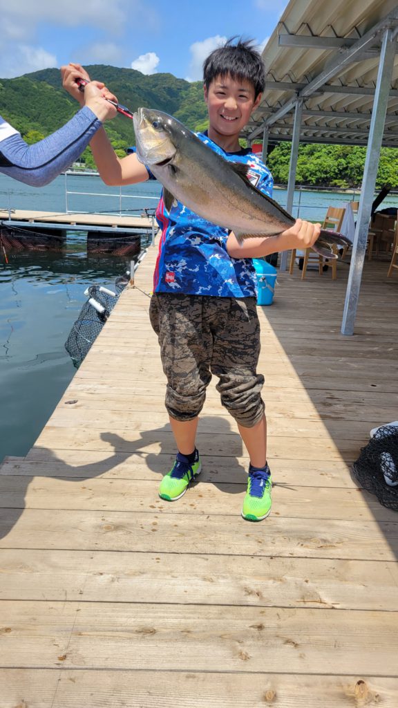 最初にシマアジを釣り上げた堤さんは、3連発で好発進。岡田さんファミリーもシマアジゲット!その後アタリもなく1回目の放流になり、その頃は天気も回復して水面を照らす光が眩しいほどです。