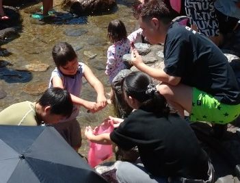 鮎は自分が焼いて、熱々ホクホクの塩焼きや、鮎のフライ、鮎雑炊など色々いただきました。お腹一杯になった後は、子供は鮎の掴み取りへ。14捕まえた強者の子もいました。