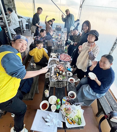 続いて二見ヶ浦のBBQ場へ向かいました。BBQ場では新鮮な伊勢湾の魚介類やお肉などが並んでおり、特に活きた車エビを水槽から捕まえるのに一苦労しましたが、とてもいい体験でした。乾杯の挨拶を終え、全員が各々にお肉や魚介類など焼き始めBBQを堪能していました。
