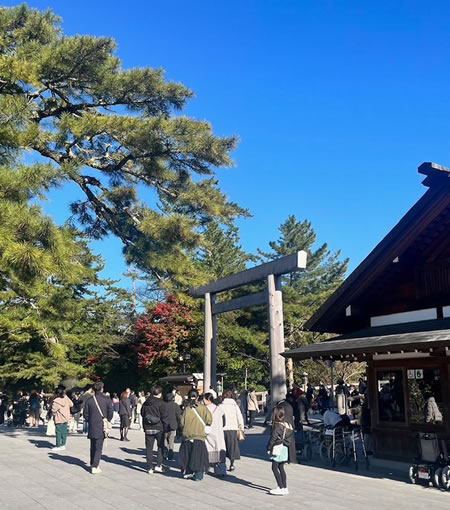 最後に、伊勢神宮に向かいおかげ横丁で散策しました。昔ながらの街並みと出店のいい香りが漂っており、お腹がいっぱいにもかかわらずたくさん食べてしまいました。