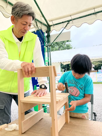 真剣な顔つきで丸太切り、ミニ椅子作りしているお子様を見守っている保護者の様子がとても微笑ましくなります。