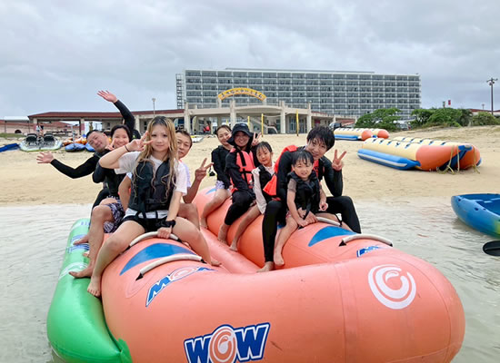 2日目は、海でのアクティビティ!残念ながら2日目も雨でしたが、雨でも大丈夫なのが海でのアクティビティ。カヤックやSUP、バナナボート、乗り物見たら海に出る前から座席取り!?僕はここ!私はここ!低年齢の子供たちも大はしゃぎ!1人じゃないから怖くないようでどんどんチャレンジ!それ見て大人も負けじとたくさん楽しみました!