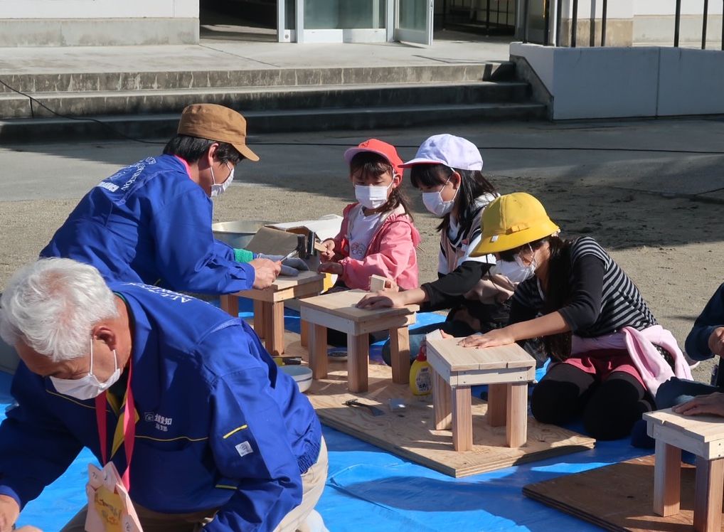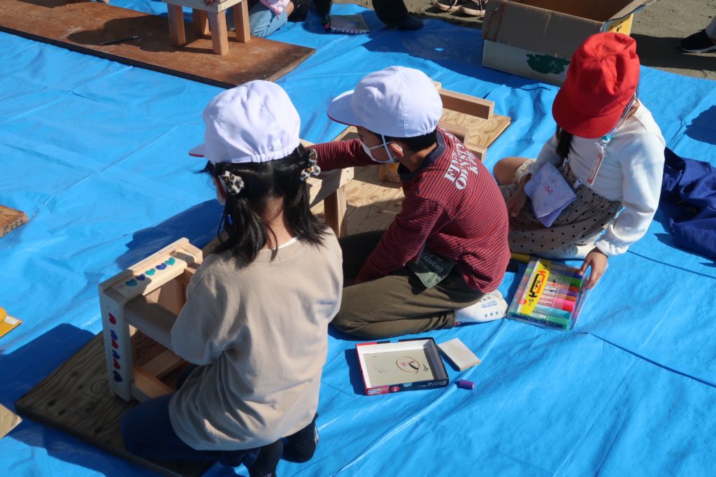 10月26日(火)、前日の雨とはうってかわり素晴らしい秋空のもと、毎年恒例の木工教室を校庭で行いました。