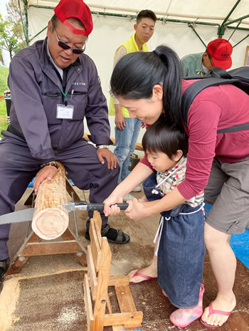 今年は両日とも雨天で足元の悪い中、約80人のお子様が丸太切り体験そしてミニ椅子作りには10人のお子様に体験してもらう事ができました。