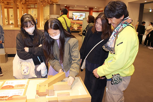 ここは1300年前の平城宮にタイムスリップできる施設です。展示室には組物体験コーナーなどがあり、親子が試行錯誤しながら当時の技術を学んでいました。
